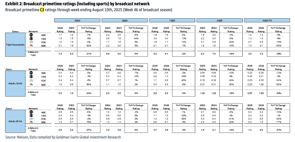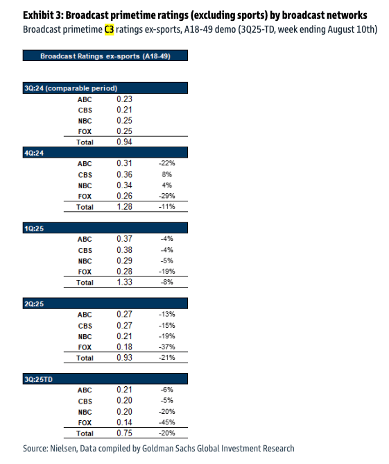 • Prime time commercial ratings for broadcast ex-sports were down 20% yoy in 3Q25-to-date (through week ending August 10).