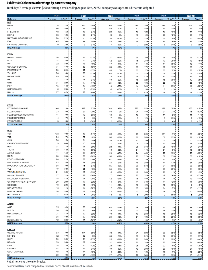 -28% yoy 3Q25-to-date Aggregate cable network primetime ratings (C3, A18-49 demo) were down 28% yoy in 3Q25-to-date, worse than 21% decline in 2Q25. In 3Q25-to-date, total day ratings (C3, target demos) declined at DIS (-3%), PSKY (-18%), WBD (-20%), CMCSA (-44%), AMCX (-28%), and FOX (-23%). FNC was down 18% yoy in the same period. For a sequential comparison, in 2Q25 ratings declined at DIS (-17%), PSKY (-21%), WBD (-19%), CMCSA (-25%), and AMCX (-17%), while FOX (18%) grew.