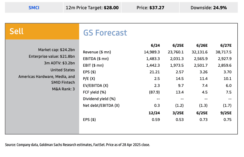 SMCI negatively pre-announced F3Q25 with a revenue, gross margin, and EPS miss. Revenue of $4.5-$4.6 bn missed GS/consensus of $5.3/$5.4 bn (prior guidance of $5.0-$6.0 bn) with SMCI citing customer delays into F4Q. Gross margins of 9.7% declined 220 bps qoq and reflected higher inventory reserves from older generation product and expedite costs to enable time-to-market for new products. EPS of $0.29-$0.31 missed GS/consensus of $0.53/$0.53 (prior guidance of $0.46-$0.62). SMCI will have its earnings call on May 6 after-market.