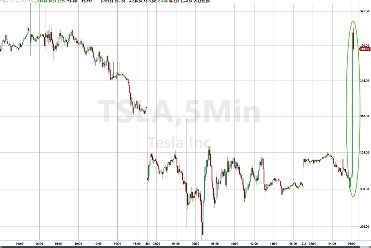 Tesla's Q2 delivery numbers came in at 384,122 vehicles, just below the estimate of 389,407. While estimates had been lowered multiple times, the number is still better than whisper numbers as low as 350k or 360k that were starting to make their way around the street over the past week. As a result, Tesla stock has popped this morning by almost 7%.