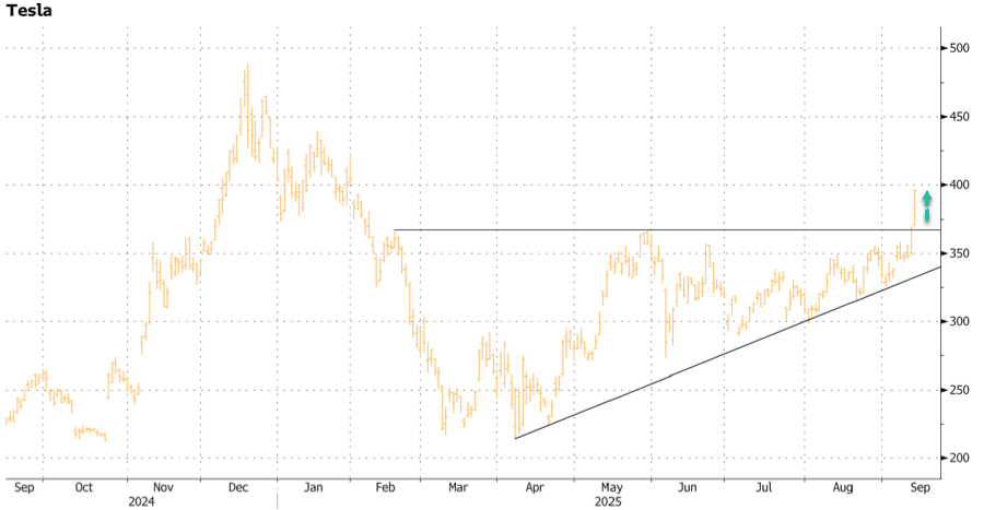 Tesla shares are on the verge of a technical breakout - something that unhinged Democrats (CC: Tim Walz) must be absolutely furious about - after a new SEC filing revealed that Elon Musk went on a Friday shopping spree, snapping up roughly $1 billion worth of stock. The move has boosted Tesla's market cap by $100 billion, a savvy squeeze on the shorts.