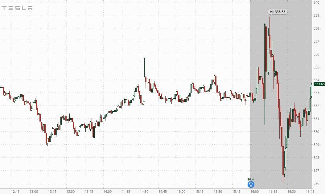 Following the earnings report, the stock first moved higher, then lower, and was flat at last check, which is why Bloomberg notes that "if it seems like the adrenaline rush typically associated with Tesla earnings is missing, you’re right: Tesla shares are currently down 0.2% in postmarket trading. If this move holds through regular trading tomorrow, that would be the smallest post-earnings move in either direction since September 2020."