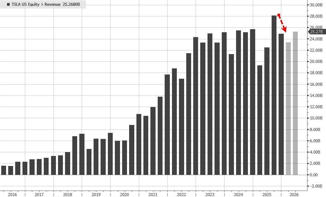 While TSLA sales have gone nowhere for years now, and 2025 even saw the first drop in full-year revenues (down 3%)...