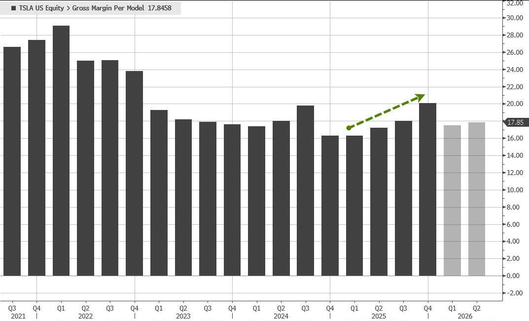 Going into Tesla earnings, we wrote in our preview that Morgan Stanley saw a "particularly wide dispersion in financial KPIs into the 4Q print and for 2026." The bank said that the stock reaction will depend on the incrementality of updates around scaling robotaxi/Cybercab, launching Unsupervised FSD, Optimus Gen 3, and AI5 on the earnings call.