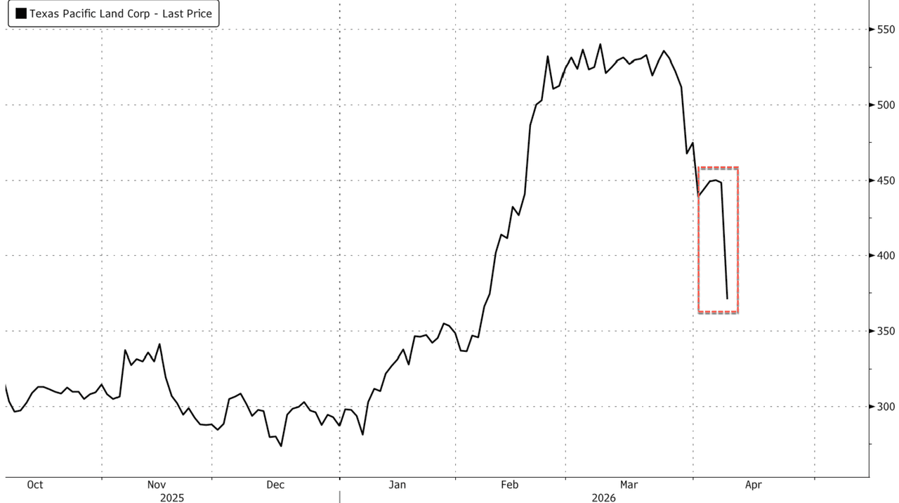 Land-and-royalty company Texas Pacific Land Corp. crashed the most since early Covid after the head of its largest shareholder unexpectedly died.