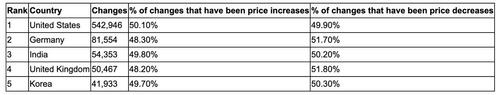 The United States leads the world in dynamic pricing activity, accounting for 542,946 price changes — far ahead of Germany, India, the United Kingdom, and Korea. Notably, U.S. price shifts were almost evenly split between increases and decreases, reflecting a highly competitive retail environment. This challenges the perception that dynamic pricing primarily pushes costs upward, as roughly half of all recorded adjustments were price reductions.