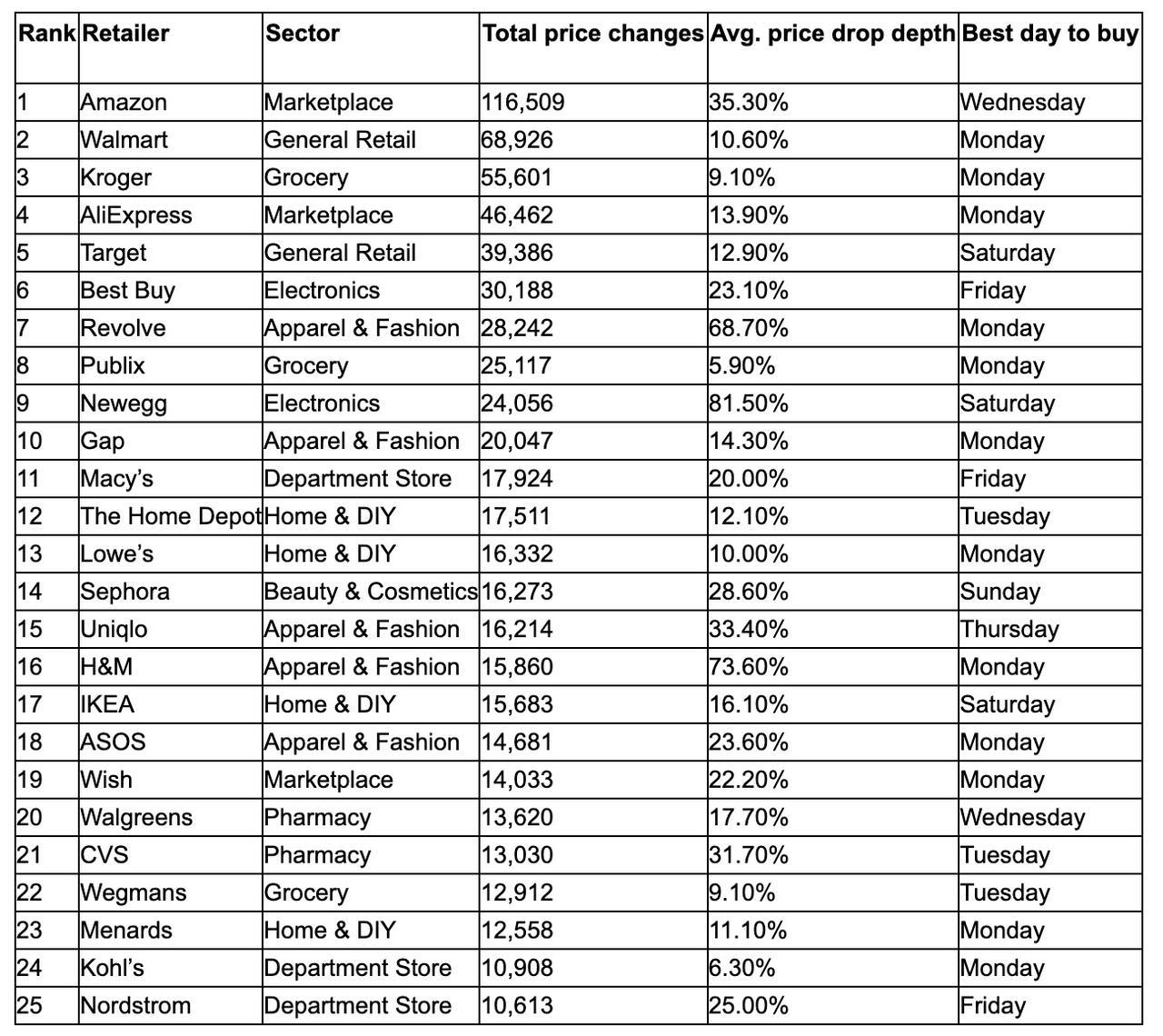 At the top of the list is Amazon, which recorded 116,509 price changes over the past year — far more than any other retailer analyzed. The online marketplace also offered the deepest average discounts, with prices dropping by 35.3% on average. According to the data, Wednesday is the best day for shoppers to find bargains on Amazon. Walmart ranked second with 68,926 price adjustments and an average discount of 10.6%, while Kroger came third, making 55,601 changes with an average 9.1% reduction. For both Walmart and Kroger, Monday emerged as the most favorable day for deals.
