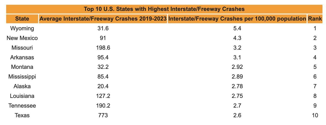 “States like Wyoming, New Mexico, and Missouri consistently see alarmingly high rates of interstate freeway crashes,” the spokesperson said. “Factors such as long rural stretches, high-speed travel, and limited visibility often create dangerous driving conditions that put lives at risk every day.”