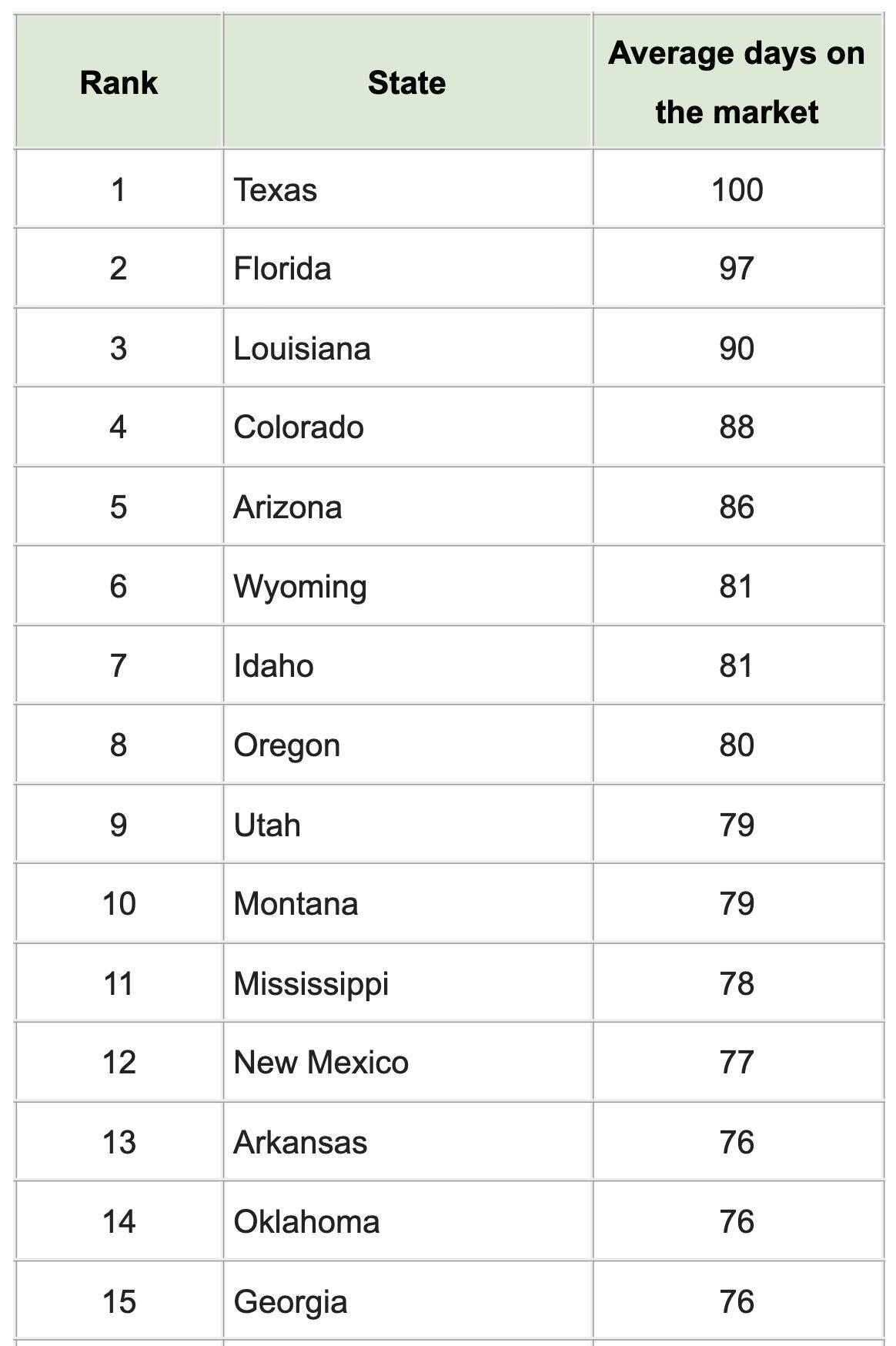 Texas stands out as the slowest-moving market in the country, with homes spending an average of 100 days on the market. Florida follows closely at 97 days, signaling a major slowdown after years of rapid growth. Louisiana ranks third at 90 days, while Colorado and Arizona also face extended selling times at 88 and 86 days, respectively. In these states, rising inventory and buyer hesitation have made it harder for sellers to secure quick offers.