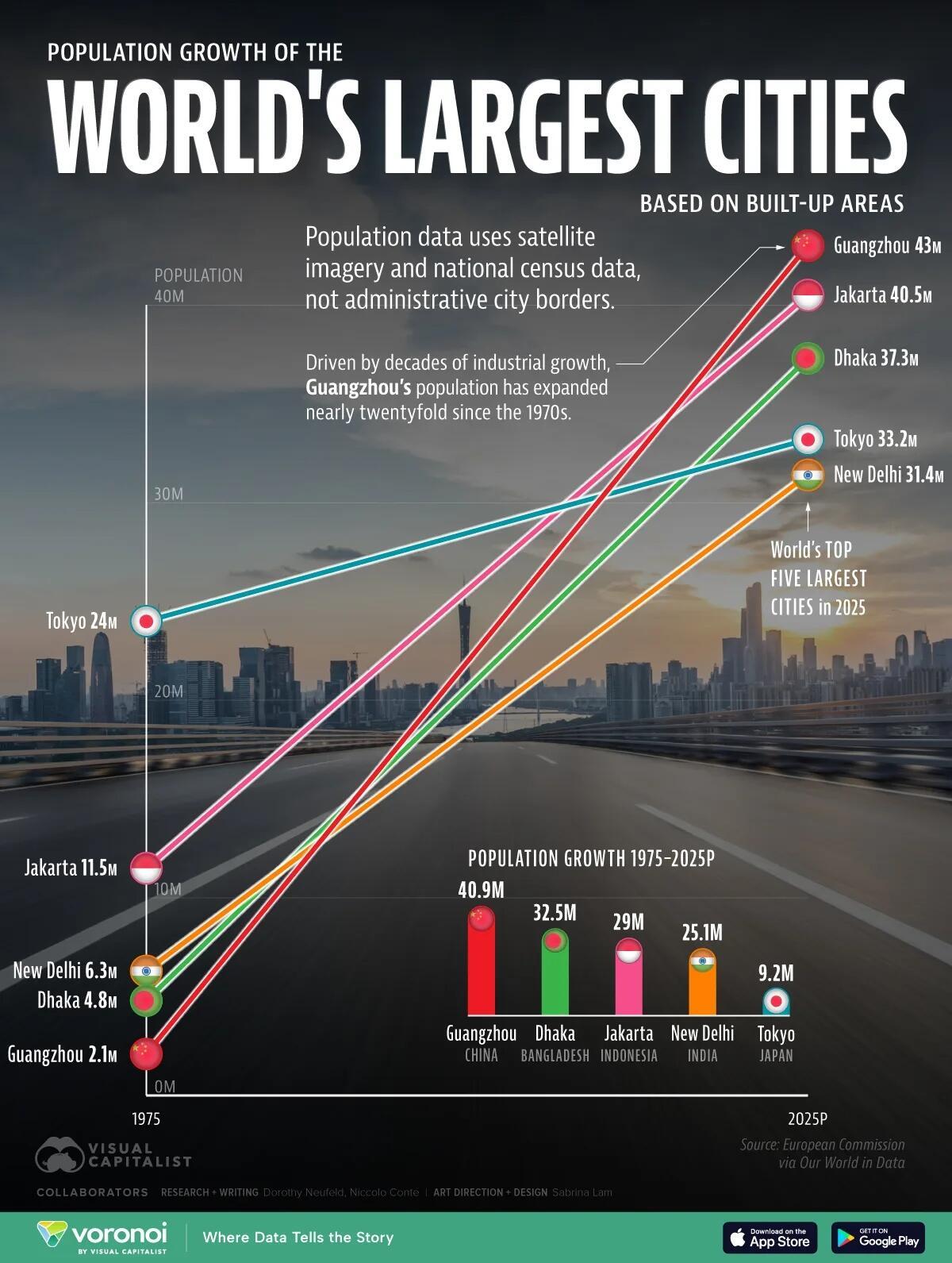 Below, we show the rise of the top five largest cities worldwide—using satellite imagery and census data—not administrative borders: