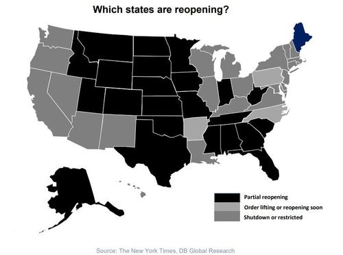 Adding to the complexity, in recent days we have observed that this distinction has increasingly fallen along party lines, with democratic states refusing to reopen or happy to wait (and in the case of California warning it may be shut for another 3 months), while mostly Republican states already pursuing a partial or full reopening.