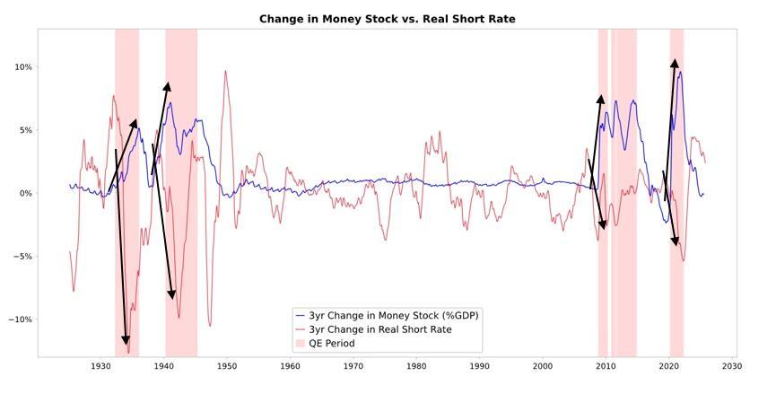 When the Fed and/or other central banks buy bonds, it creates liquidity and pushes real interest rates down as you see in the chart below.