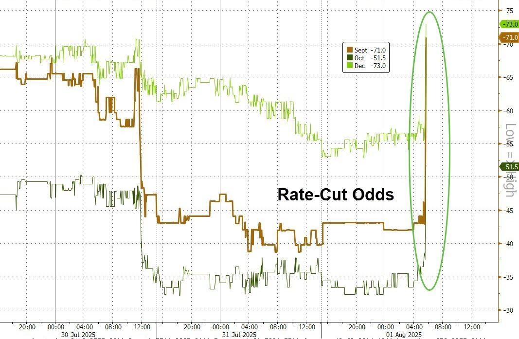 Weaker than expected job gains combined with rising unemployment rates and massively negative revisions have sent rate-cut odds soaring with September now priced around 75%...
