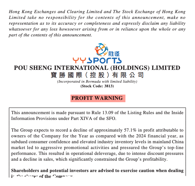 On Friday, Pou Sheng, a major distribution and retail channel for Nike in Greater China, warned that its 2025 attributable profit will likely plunge 57% year over year to RMB 211 million, while revenue is expected to decline 7.2% to RMB 17.1 billion.