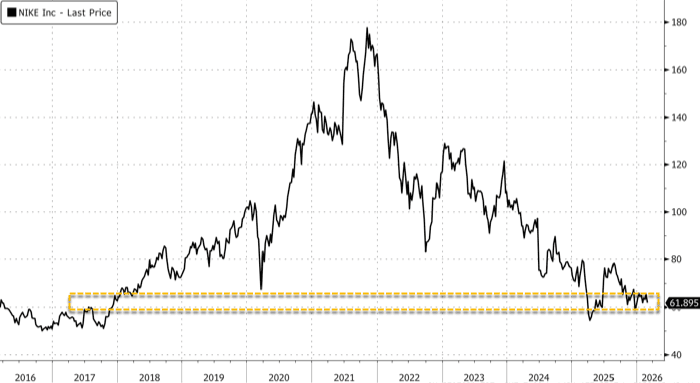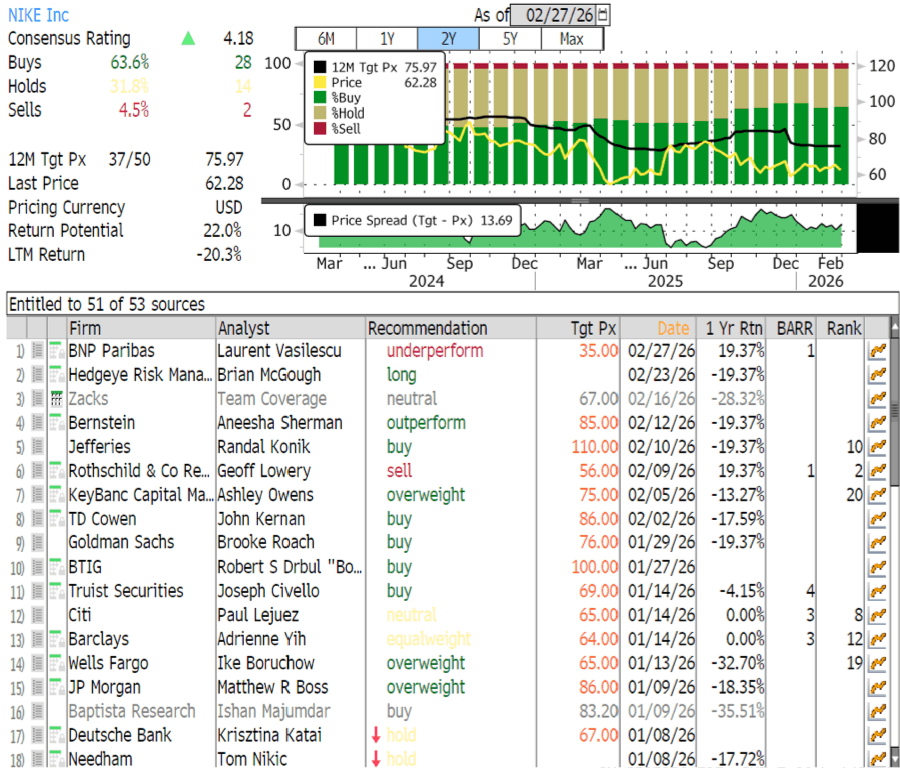 He rates Nike as underperform with a $35 price target. Bloomberg data show Nike still has mostly bullish Wall Street coverage overall, with 28 buys, 14 holds, and 2 sells, and an average price target of $76.