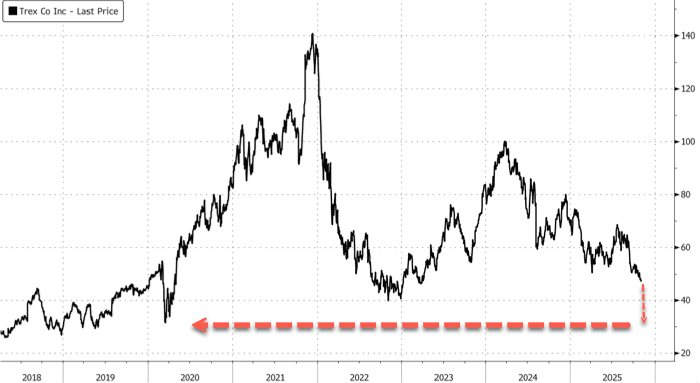 Trex shares plunged to early-2020 lows amid the dismal outlook.