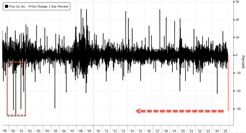 Shares of Trex Company, best known for its wood-alternative composite decking, plunged the most since the Dot Com bust in premarket trading after the company's fourth-quarter net sales forecast came in below Bloomberg Consensus estimates. Analysts warned that soft consumer spending trends and a deteriorating home-improvement backdrop are weighing on demand.