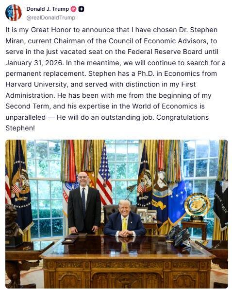 Update: Trump just confirmed that Miran will serve on the Board until Jan 31, 2026, as replacement for outgoing governor Kugler.