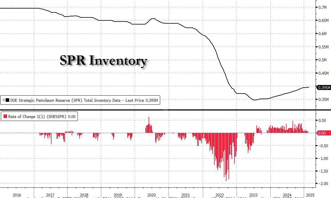 Trump has vowed to refill the oil reserve, which has a maximum capacity of about 700 million barrels. It currently has about 408 million barrels, but the administration has limited funds to buy more. Unfortunately just 1 million here and there won't do anything in the grand scheme of things; meanwhile China has been aggressively adding millions of barrels every month to its SPR, and according to many analysts has been the main reason preventing far lower oil prices. Here is Reuters on the topic: