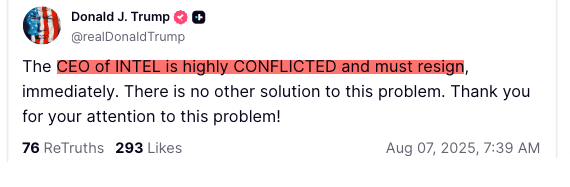 "The CEO of INTEL is highly CONFLICTED and must resign, immediately," Trump wrote on his social media platform.