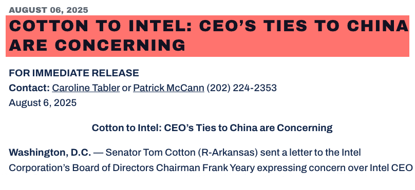 Cotton also criticized Intel's decision to hire Tan despite these associations, especially given the company's nearly $8 billion award under the CHIPS Act and its role in the Secure Enclave program, which requires strict compliance with national security protocols.