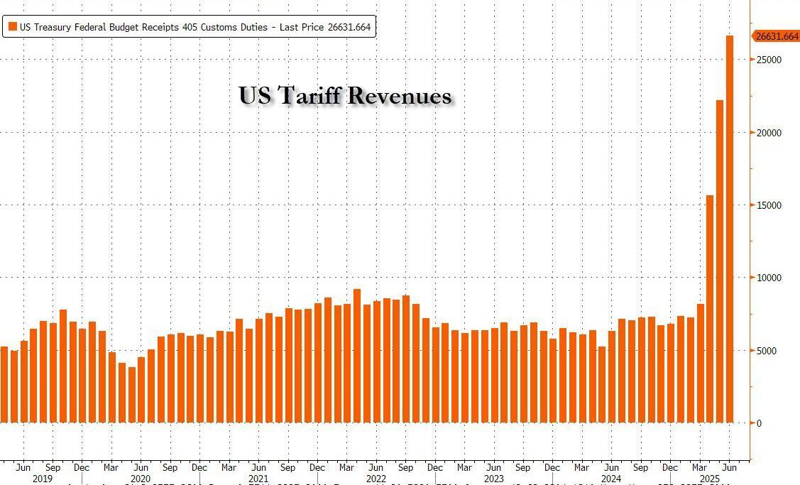 The deal comes just days after we learned that in June the US collected a new record in tariff revenue, some $26.6 billion: a number which annualizes to an impressive $320 billion.