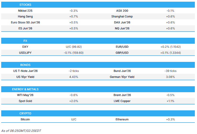 - APAC stocks were cautious but off worst levels; European equity futures indicate a positive cash market open with Euro Stoxx 50 futures up 0.5%.