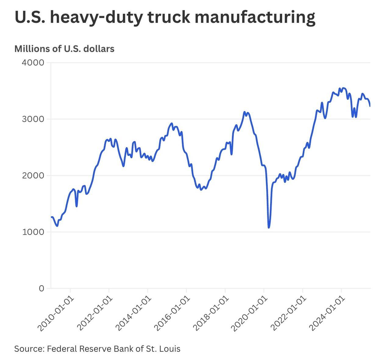 Mexico is the largest supplier of medium- and heavy-duty trucks to the U.S., followed by Canada, Japan, Germany, and Turkey. Heavy-truck shipments from U.S. plants climbed from a low of $1.1 billion in April 2020 to $3.2 billion this July, though they have dipped modestly this year, Federal Reserve data shows.