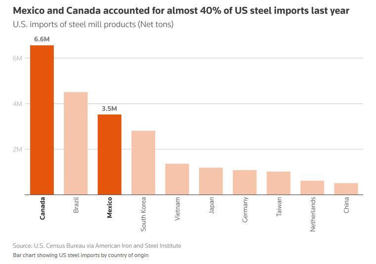 The five largest sources of imported steel into the US are Canada, Brazil, Mexico, South Korea and Vietnam.