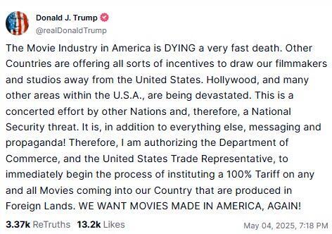 Think Trump's tariffs are only for products, think again. On Sunday evening, President Donald Trump announced that he plans to impose a 100% tariff on films produced overseas, extending his restrictive trade policies on US imports to the entertainment sector for the first time.