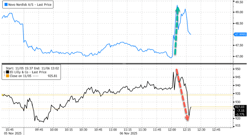 In markets, Novo ADR shares initially rose on news of the White House drug deal before giving up most of those gains, while Lilly shares fluctuated and eventually turned lower.