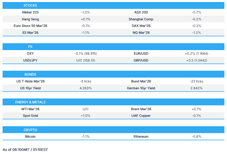 - US cash indices were closed on Monday due to MLK Jr. Day, but equity futures saw weakness, with NQ & RTY underperforming as geopolitical tensions with the US over Greenland weighed on sentiment.