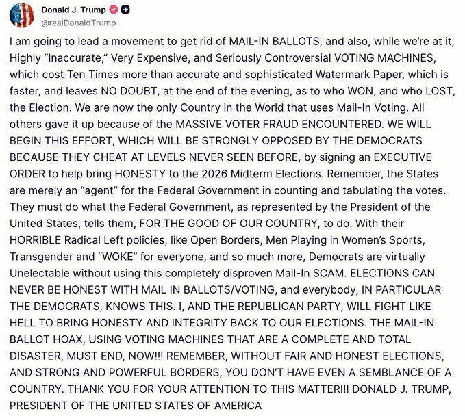 Trump Vows 'Movement' To Eliminate Mail-In Ballots Before 2026 Midterms