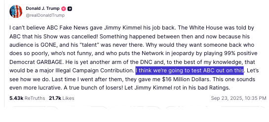 Trump Will "Test ABC Out" After Kimmel's Surprise Return Amid Ratings Slide