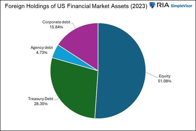 The blessing of the dollar reserve status for the US is cheap debt. The result, as we shared above, is enormous wealth. However, our wealth somewhat depends on financial leverage and inflated asset valuations. If foreign investors were to reduce their holdings of US loans and securities, financial asset prices would likely decline, and our wealth would follow.