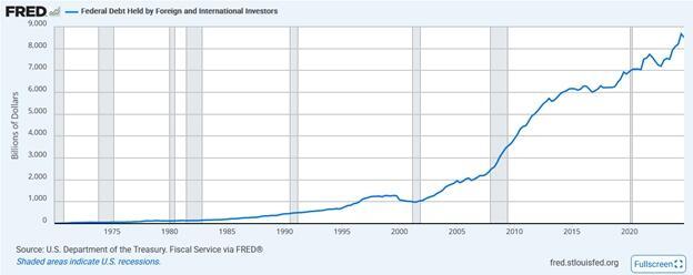 - According to US Treasury TIC data, foreigners have lent us $26 trillion in US debt and equity. That number likely understates foreigners’ total investment in the US.