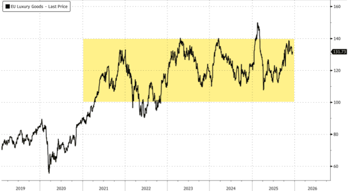 European luxury stocks have been locked in a 4.5-year trading range, oscillating between peaks and troughs rather than the up-and-to-the-right pattern seen with AI stocks.