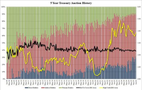 Just after 1pm, the US completed the sale of $70BN in 5Y paper at a high yield of 3.823%, up from 3.747% one month ago and the highest since July. It also tailed the When Issued 3.820% by 0.3bps, the 7th tail in the last 8 auctions.