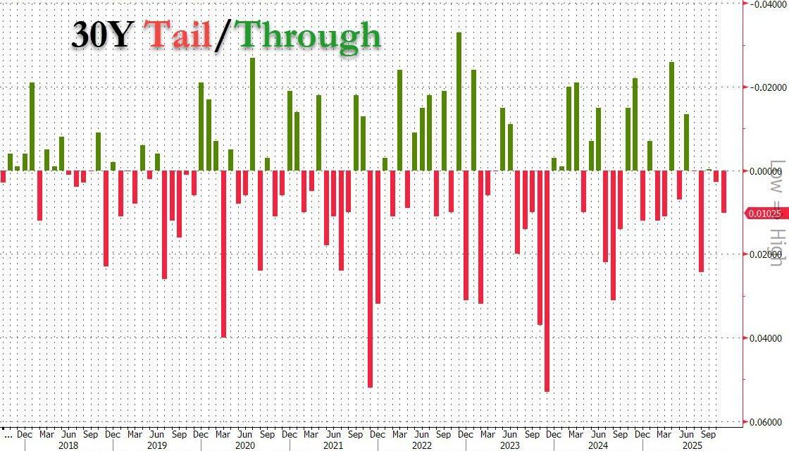 The auction stopped at high yield of 4.694%, down from last month's 4.734%, but it also tailed the When Issued 4.684% by 1.00 basis point. This was the second tail in a row, and the biggest since August when the auction tailed by 2.1bps.