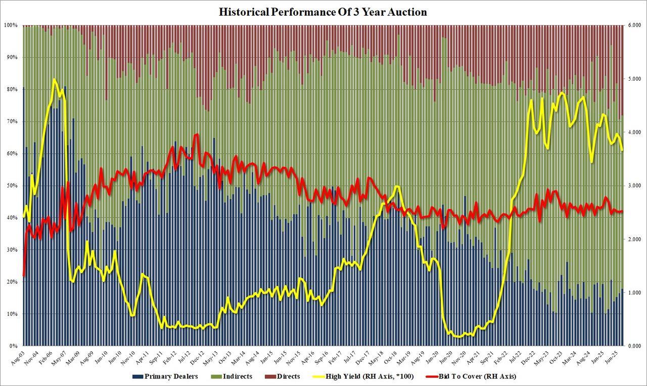 The internals were uglier: Indirects dropped to 53.99 from 54.11, the lowest since Dec 2023. And with Directs once again awarded a surprisingly high 28.1%, which was down from the record 29.4% in July but otherwise was the 2nd highest on record, Dealers were left with 17.9%, up from 16.5% and the highest since April as buyside demand among foreigners, for 3Y paper remains surprisingly weak.