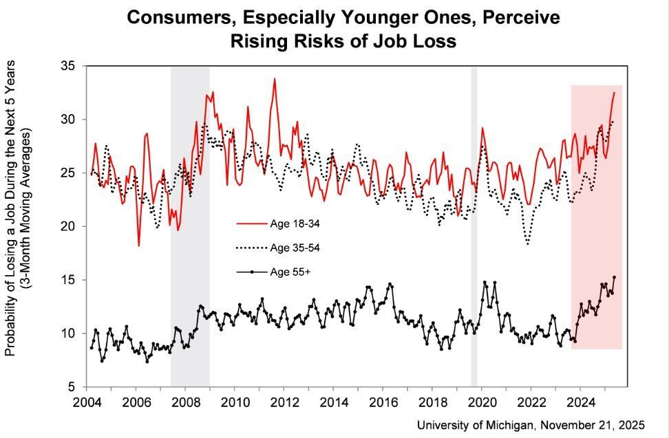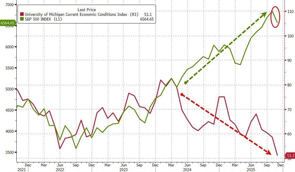 The weakness from the preliminary UMich data for November has been confirmed with the final sentiment print confirmed the so-called 'K-shaped' economy as sentiment slumps with stocks near record highs.