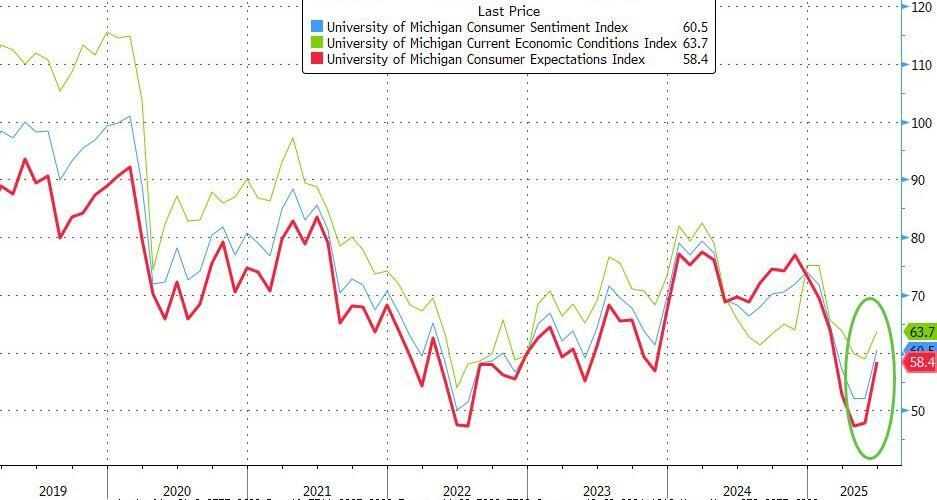 The headline Sentiment print jumped dramatically from its lowest since May 1980 - to 60.5, well above the median estimate of 53.6