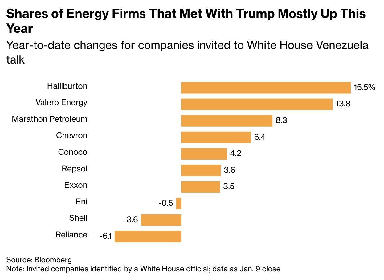 Bloomberg writes that Trump, however, left the meeting projecting momentum. “We sort of formed a deal,” he told reporters, predicting companies would soon be investing “hundreds of billions of dollars in drilling oil.” Yet when pressed for specifics, Energy Secretary Chris Wright acknowledged that Chevron — the only U.S. major still operating in Venezuela — was the only firm to make a concrete pledge. Chevron Vice Chairman Mark Nelson said production, now about 240,000 barrels per day, could rise by roughly 50% within 18 to 24 months.