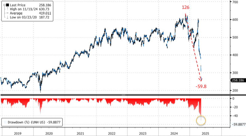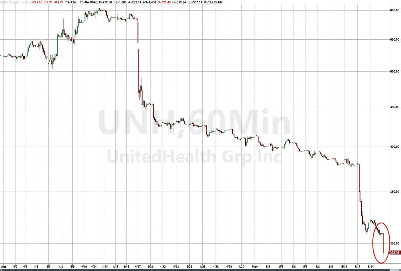 Shares of UnitedHealth are down 17% on the session. Since mid-April, shares have crashed 58% on a series of negative news, including earlier this week: