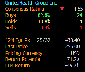 This is comical: Bloomberg data shows that 82.8% of analysts covering UnitedHealth Group still rate the stock a "Buy," with an average 12-month price target of $438. The current price is $254.