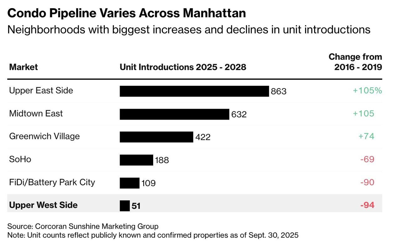 Only 51 new condo units are expected to be completed in the neighborhood through 2028, according to Corcoran Sunshine Marketing Group — a 94% drop from the 869 units added between 2016 and 2019. It’s the steepest decline among Manhattan neighborhoods tracked by the firm.