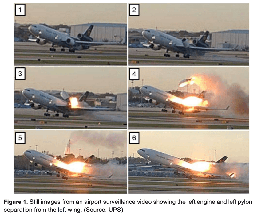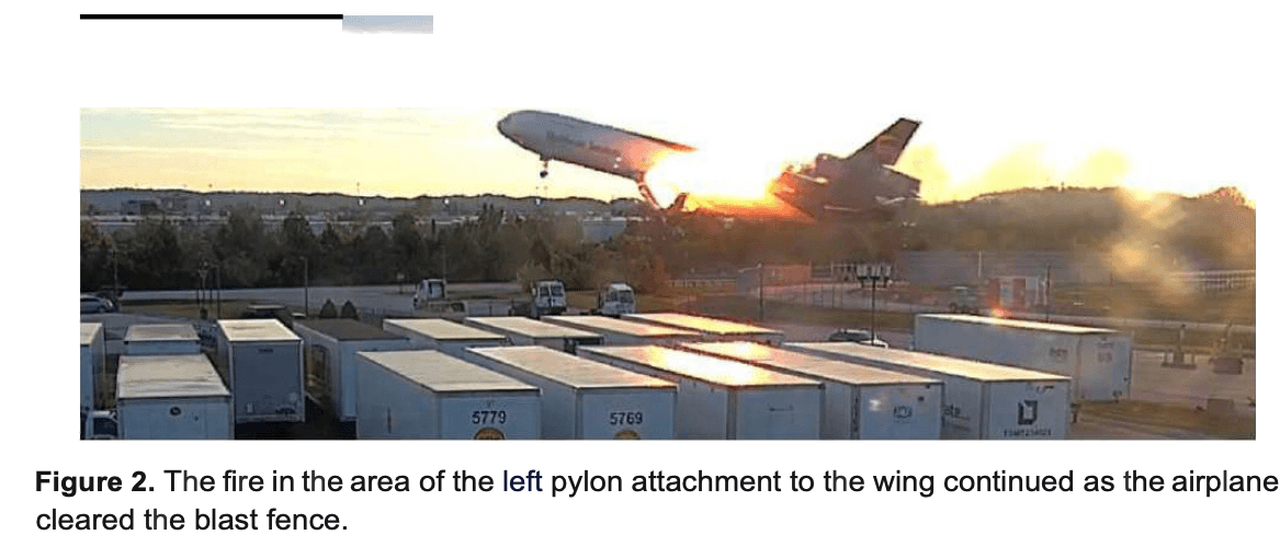 Last week, investigators with the National Transportation Safety Board released frame-by-frame images showing the left engine of the UPS MD-11F freighter separating from the aircraft in Louisville. NTSB's preliminary report showed the left engine (No. 1) and entire pylon assembly tore away from the wing immediately after rotation -- the act of raising the nose of the jet at takeoff -- igniting into a massive fireball.