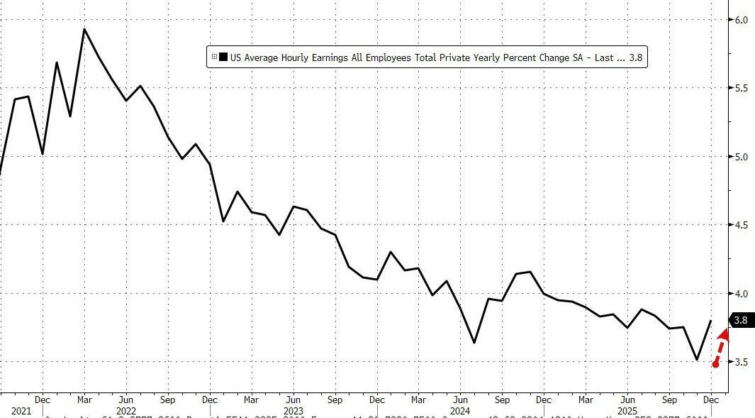 While jobs came on the cool side, hourly earnings came slightly hot: rising 0.3% MoM, up from 0.2% in November (and in line with estimates), this translates to a 3.8% increase YoY, up from 3.6% and above the 3.6% expected.