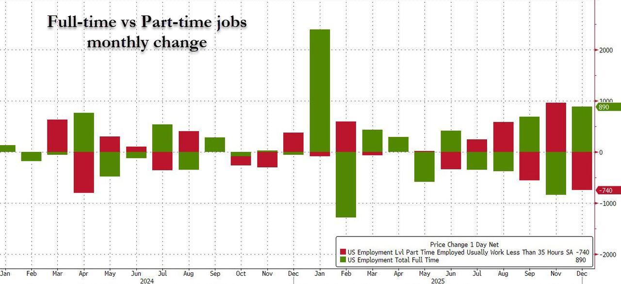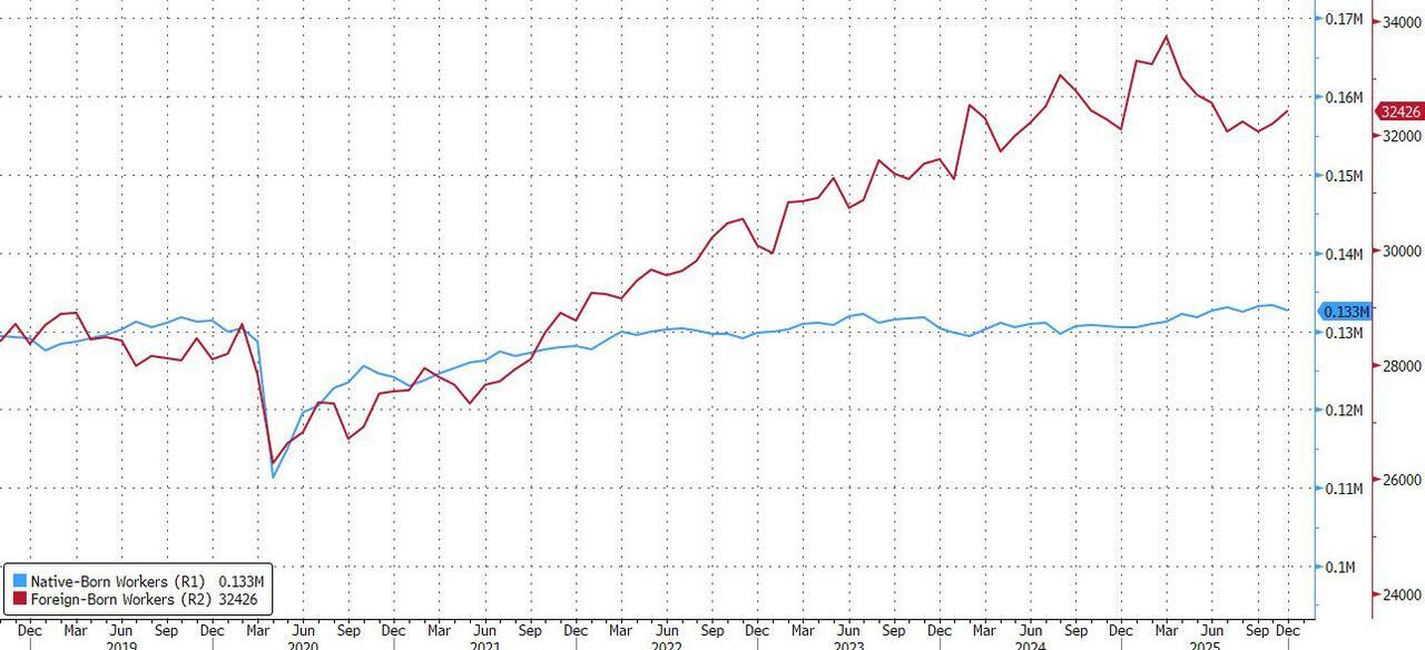 And one red flag: the number of native-born workers dropped by 656K to 132.6 million, while foreign-born workers rose by 310K to 32.426 million, a modest reversal of the trends observed in 2025.