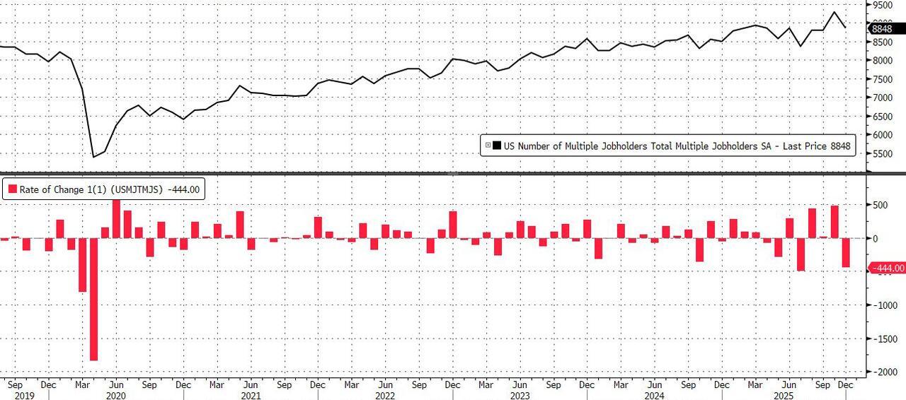 ... while the number of multiple jobholders slumped by 444K - the second biggest drop since Covid - to 8.848MM.